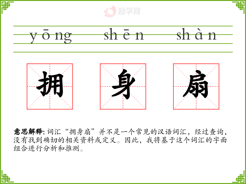 词汇“拥身扇”并不是一个常见的汉语词汇,经过查询,没有找到确切的相关资料或定义。因此,我将基于这个词汇的字面组合进行分析和推测。