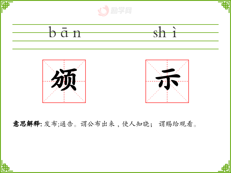 颁示的意思是:发布;通告。谓公布出来﹐使人知晓; 谓赐给观看。