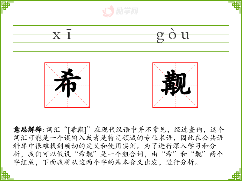 词汇“[希觏]”在现代汉语中并不常见,经过查询,这个词汇可能是一个误输入或者是特定领域的专业术语,因此在公共语料库中很难找到确切的定义和使用实例。为了进行深入学*和分析,我们可以假设“希觏”是一个组合词,由“希”和“觏”两个字组成,下面我将从这两个字的基本含义出发,进行分析。