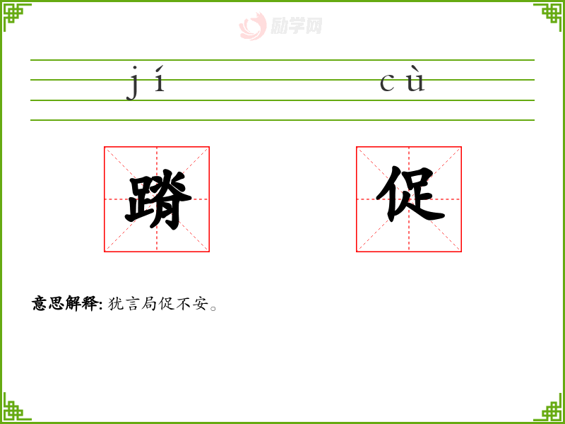 促[ cù ] 1. (形声。从人,足声。本义:紧迫。又指急促,赶快)。 2. 同本义。 【引证】 《广韵》-促,速也。 《汉书·高帝纪》注-促,速也。 唐·柳宗元《与萧俛书》-长来觉日月益促。 【组词】 促柱、 促装、 促速、 促病 [更多解释]