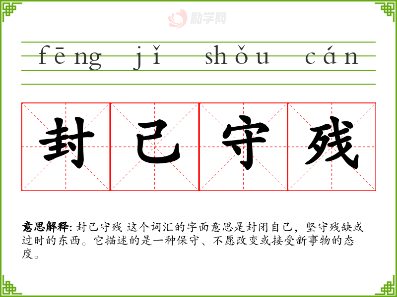 封己守残 这个词汇的字面意思是封闭自己,坚守残缺或过时的东西。它描述的是一种保守、不愿改变或接受新事物的态度。