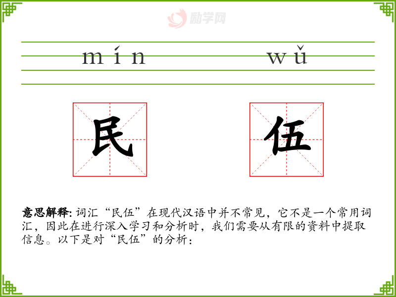词汇“民伍”在现代汉语中并不常见,它不是一个常用词汇,因此在进行深入学*和分析时,我们需要从有限的资料中提取信息。以下是对“民伍”的分析: