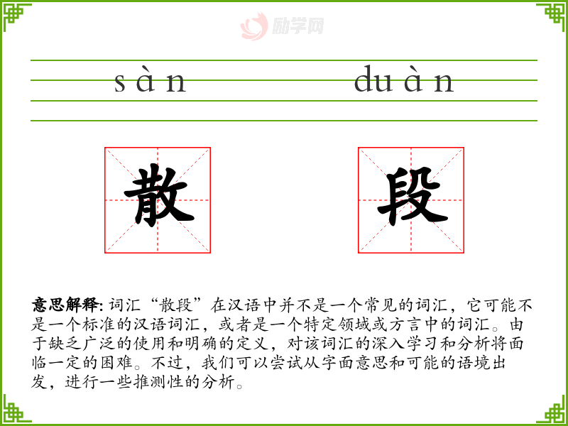 由于“散段”不是一个常见的词汇,我们对它的理解和分析非常有限。在语言学习和表达中,我们更倾向于使用明确和常见的词汇来确保沟通的有效性。如果“散段”是一个特定领域或方言中的词汇,了解其具体用法和语境将需要进一步的研究和语料收集。