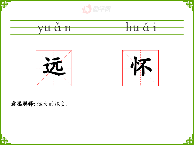 《说文》-远,辽也。 《尔雅》-远,遐也。 《礼记·王制》。注:“九州之外也。”-屏之远方。 《礼记·中庸》-柔远人也。 《礼记·乐记》-穷高极远。 《战国策·赵策》-念悲其远。 《左传·僖公三十三年》-远主备之,无乃不可乎? 《左传·三十三年》-劳师以袭远,非所闻也。 唐·杜牧《阿房宫赋》-缦立远视。 清·徐珂《清稗类钞·战事类》-火器利袭远,技击利巷战。 《广东军务记》-极目远望。