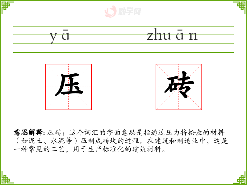 压砖:这个词汇的字面意思是指通过压力将松散的材料(如泥土、水泥等)压制成砖块的过程。在建筑和制造业中,这是一种常见的工艺,用于生产标准化的建筑材料。
