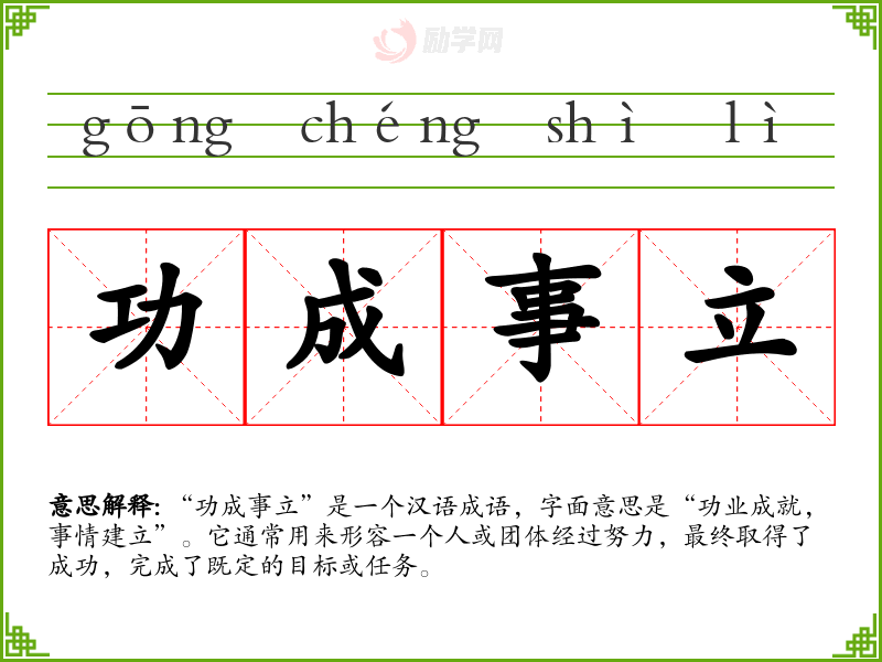 “功成事立”是一个汉语成语,字面意思是“功业成就,事情建立”。它通常用来形容一个人或团体经过努力,最终取得了成功,完成了既定的目标或任务。