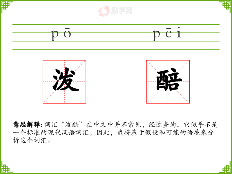 通过对“泼醅”这个假设性词汇的分析,我们可以了解到词汇的构成、可能的语境、文化背景等方面的信息。虽然这个词汇在现代汉语中不常用,但它反映了语言的丰富性和历史的深度。在语言学习和表达中,了解这样的词汇可以帮助我们更好地理解文化传统和历史背景。