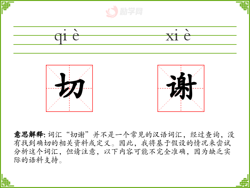 由于“切谢”不是一个已知的词汇,我对它的理解仅基于假设。在实际的语言学习和表达中,了解词汇的确切含义和用法是非常重要的。如果“切谢”是一个真实存在的词汇,建议查找更多的语料和资料来深入理解其含义和用法。