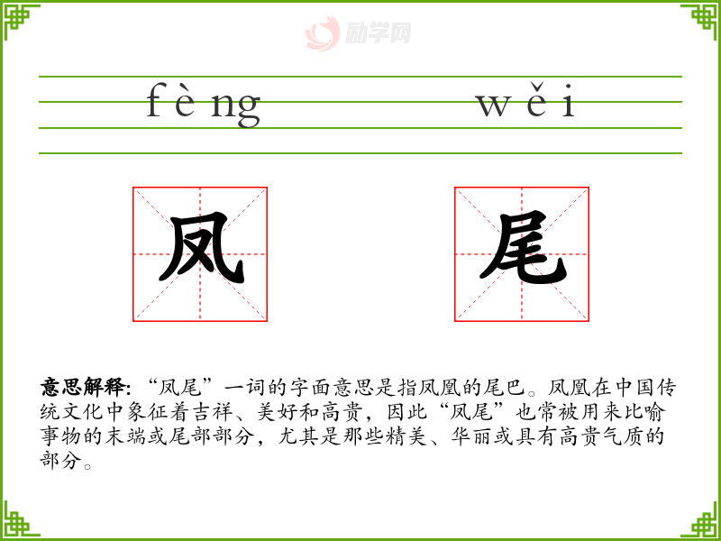 “凤尾”一词的字面意思是指凤凰的尾巴。凤凰在**传统文化中象征着吉祥、美好和高贵,因此“凤尾”也常被用来比喻事物的末端或尾部部分,尤其是那些精美、华丽或具有高贵气质的部分。