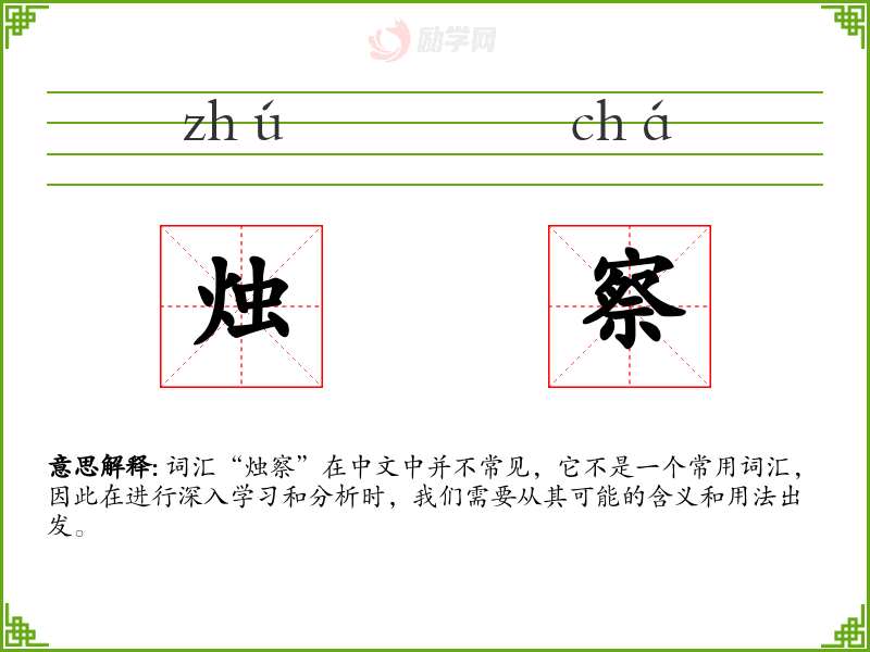 词汇“烛察”在中文中并不常见,它不是一个常用词汇,因此在进行深入学*和分析时,我们需要从其可能的含义和用法出发。