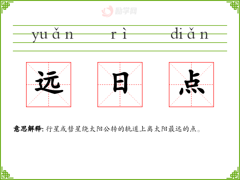 远日点的意思是:行星或彗星绕太阳公转的轨道上离太阳最远的点。