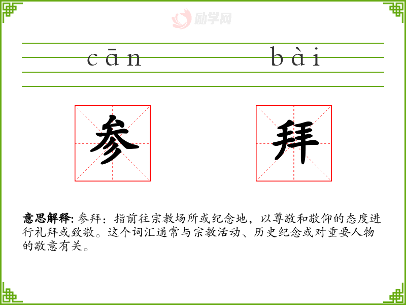 参拜:指前往场所或纪念地,以尊敬和敬仰的态度进行礼拜或致敬。这个词汇通常与活动、历史纪念或对重要人物的敬意有关。