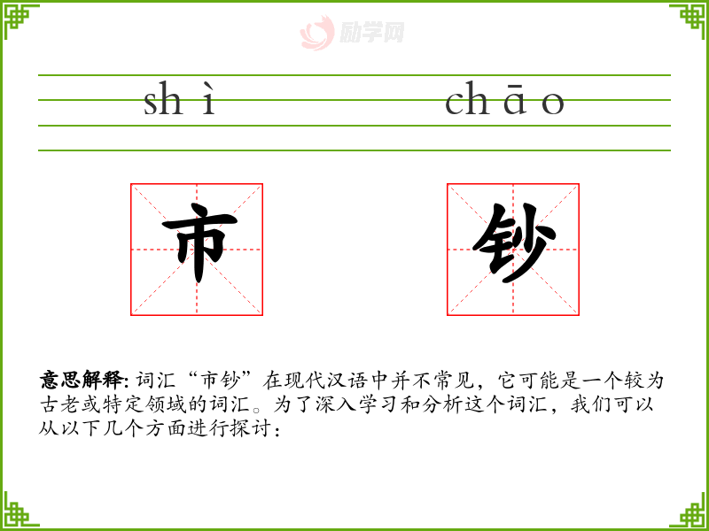 词汇“市钞”在现代汉语中并不常见,它可能是一个较为古老或特定领域的词汇。为了深入学*和分析这个词汇,我们可以从以下几个方面进行探讨: