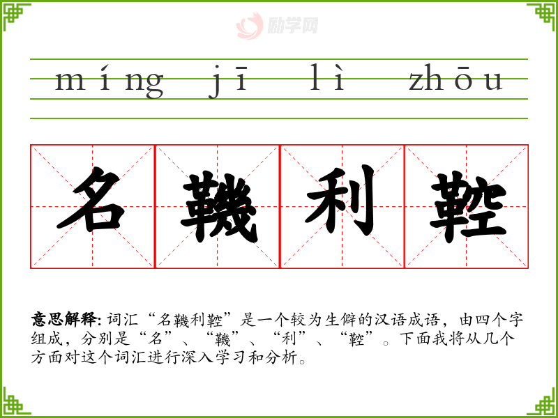 词汇“名鞿利鞚”是一个较为生僻的汉语成语,由四个字组成,分别是“名”、“鞿”、“利”、“鞚”。下面我将从几个方面对这个词汇进行深入学*和分析。