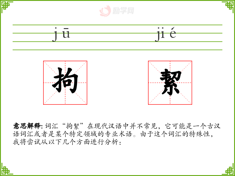 词汇“拘絜”在现代汉语中并不常见,它可能是一个古汉语词汇或者是某个特定领域的专业术语。由于这个词汇的特殊性,我将尝试从以下几个方面进行分析: