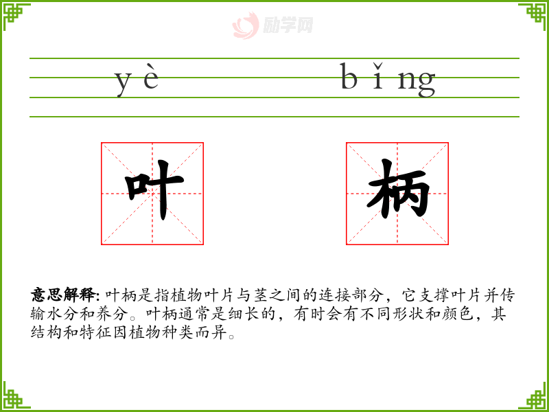 - 反义词:叶片(叶柄是叶片的一部分,但叶片不包括叶柄)