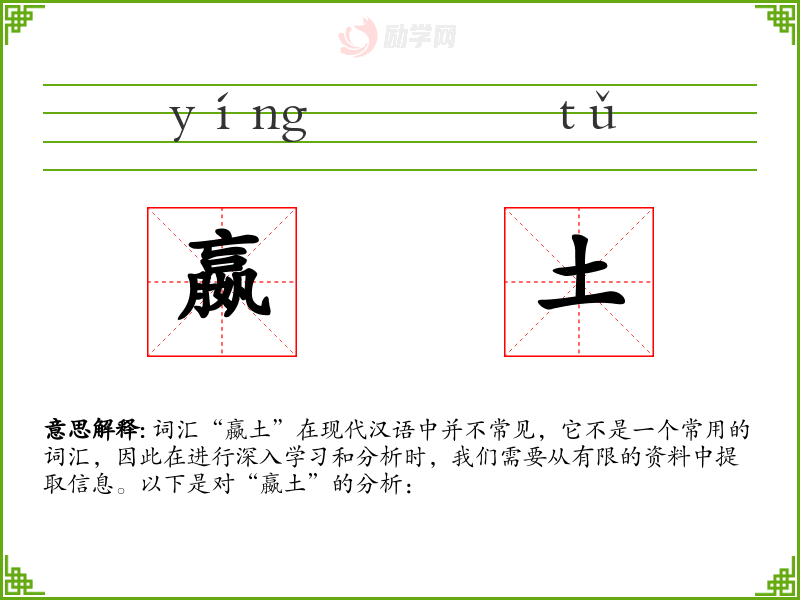 词汇“嬴土”在现代汉语中并不常见,它不是一个常用的词汇,因此在进行深入学*和分析时,我们需要从有限的资料中提取信息。以下是对“嬴土”的分析: