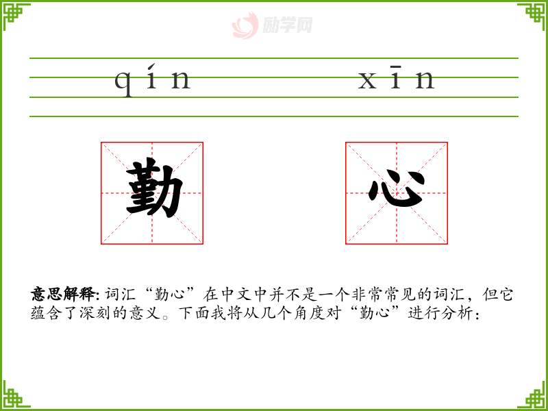 词汇“勤心”在中文中并不是一个非常常见的词汇,但它蕴含了深刻的意义。下面我将从几个角度对“勤心”进行分析: