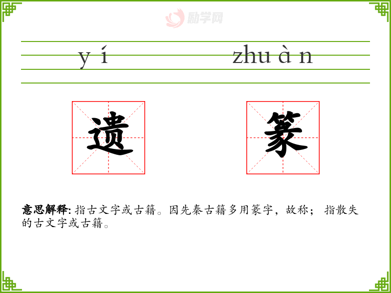 遗篆的意思是:指古文字或古籍。因先秦古籍多用篆字,故称; 指散失的古文字或古籍。