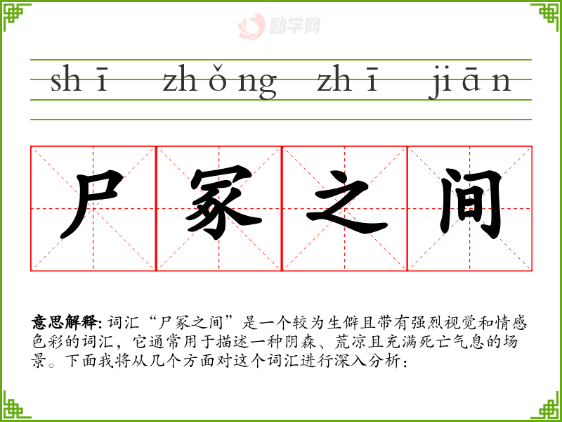 词汇“尸冢之间”是一个较为生僻且带有强烈视觉和情感色彩的词汇,它通常用于描述一种阴森、荒凉且充满死亡气息的场景。下面我将从几个方面对这个词汇进行深入分析: