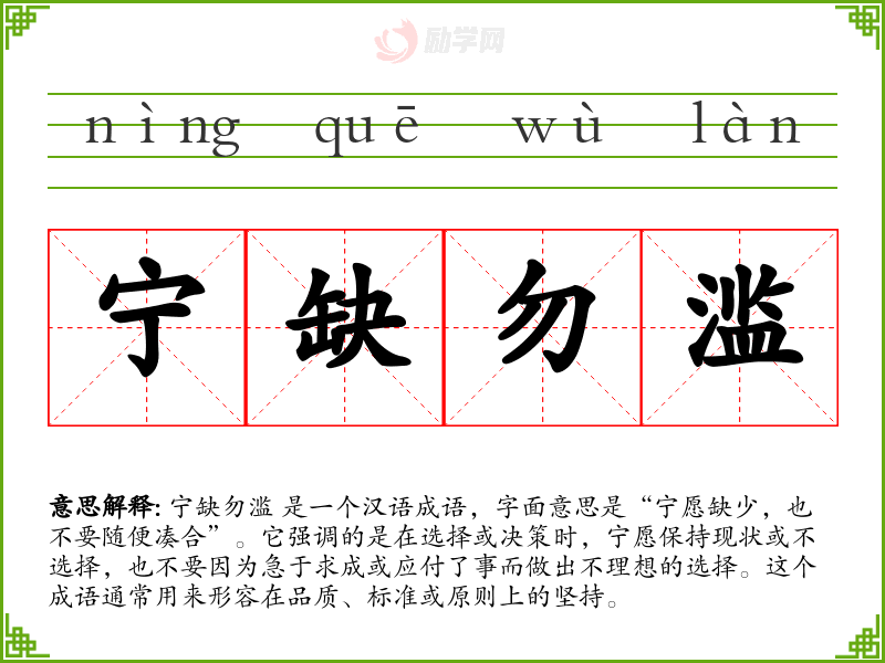 宁缺勿滥 是一个汉语成语,字面意思是“宁愿缺少,也不要随便凑合”。它强调的是在选择或决策时,宁愿保持现状或不选择,也不要因为急于求成或应付了事而做出不理想的选择。这个成语通常用来形容在品质、标准或原则上的坚持。