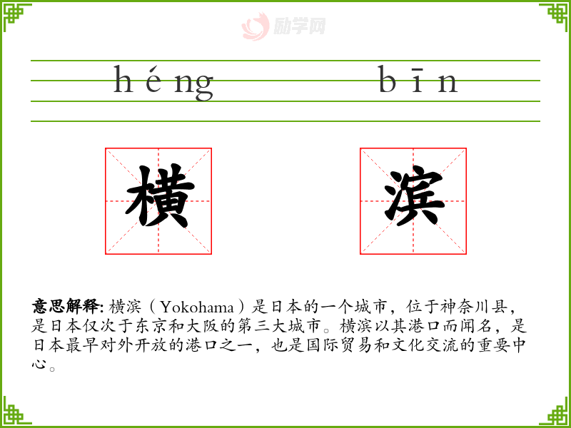 横滨的意思是:日本著名贸易港和工业中心。人口2959万(1985年)。全国第二大城市。京滨工业区的重要中心,以汽车、炼油、造船、钢铁工业为主。对外贸易额居全国之冠。是世界大港之一。市内外交通发达。市内中华街为华侨集中地。