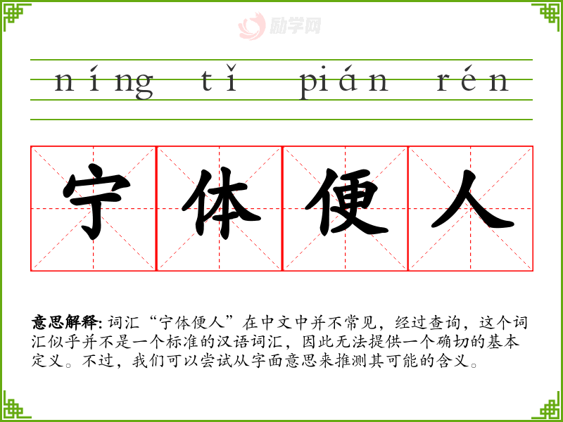 由于“宁体便人”不是一个标准的汉语词汇,对其的理解和分析存在很大的不确定性。在语言学习和表达中,遇到此类词汇时应谨慎使用,并尽可能查找更多的信息来确认其含义和用法。在学习和使用汉语时,应注重积累常用词汇和表达,以提高沟通的准确性和效率。