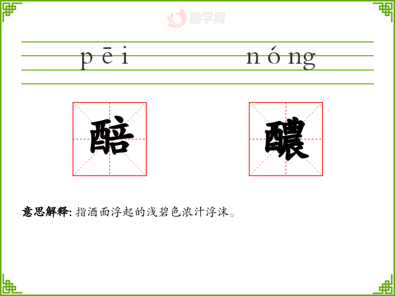 醅醲的意思是:指酒面浮起的浅碧色浓汁浮沫。