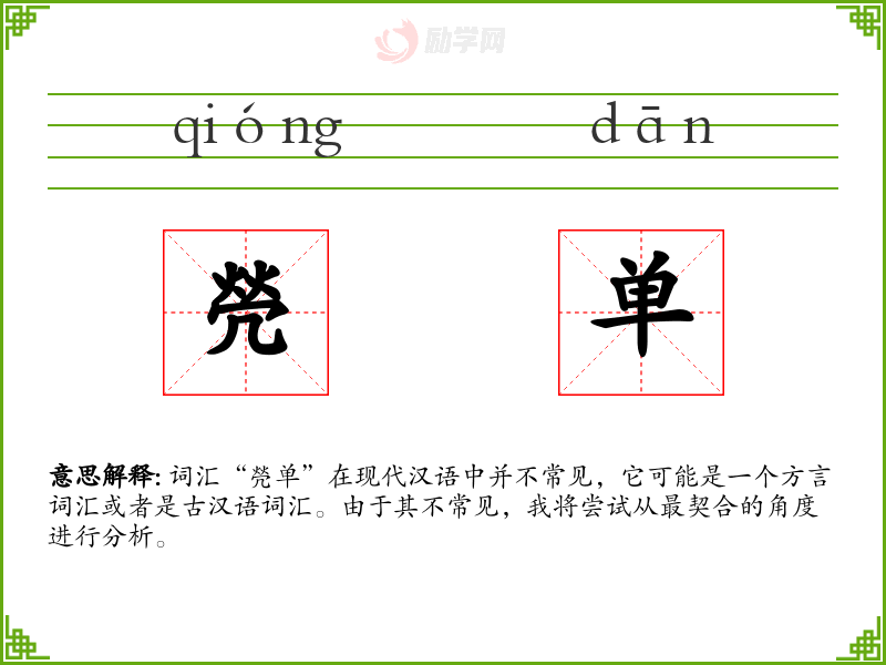 词汇“焭单”在现代汉语中并不常见,它可能是一个方言词汇或者是古汉语词汇。由于其不常见,我将尝试从最契合的角度进行分析。