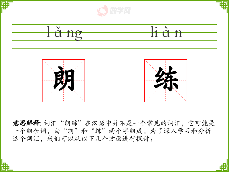 词汇“朗练”在汉语中并不是一个常见的词汇,它可能是一个组合词,由“朗”和“练”两个字组成。为了深入学习和分析这个词汇,我们可以从以下几个方面进行探讨:
