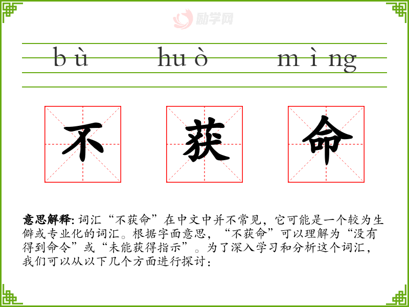 词汇“不获命”在中文中并不常见,它可能是一个较为生僻或专业化的词汇。根据字面意思,“不获命”可以理解为“没有得到命令”或“未能获得指示”。为了深入学习和分析这个词汇,我们可以从以下几个方面进行探讨:
