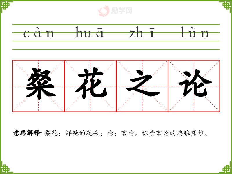 粲花之论的意思是:粲花:鲜艳的花朵;论:言论。称赞言论的典雅隽妙。