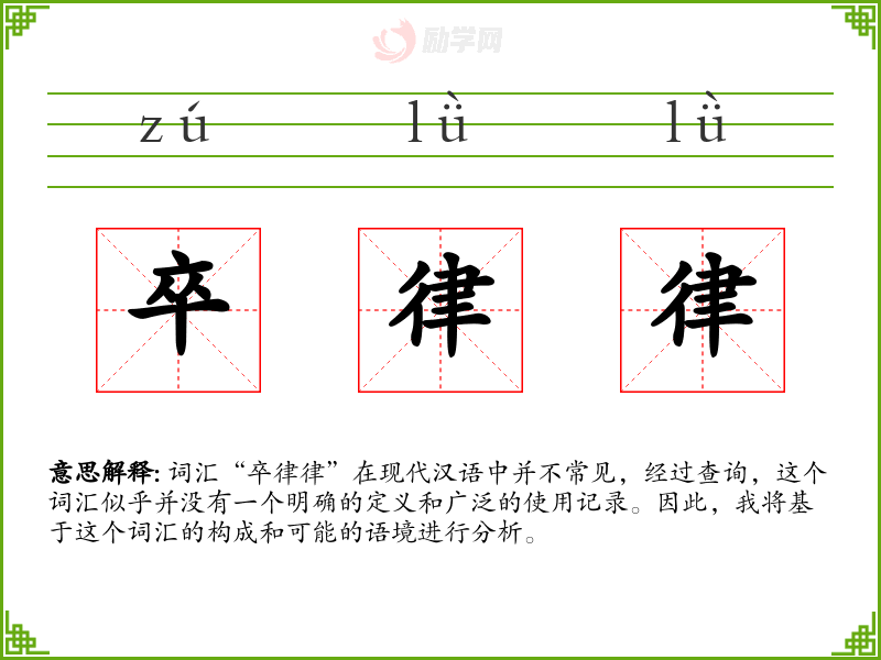 由于“卒律律”不是一个标准的汉语词汇,我们无法给出一个确切的字面意思和基本含义。但从字面上看,“卒”通常指士兵或结束,“律律”则没有明确的意义,可能是拟声词或重复以加强语气。