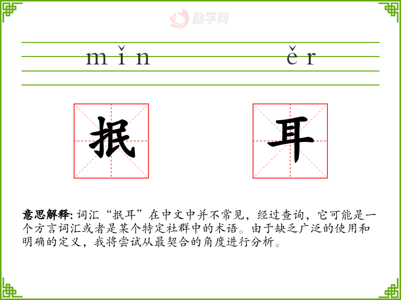 由于“抿耳”不是一个标准汉语词汇,我们无法给出一个确切的字面意思和基本含义。它可能是指某种动作,比如轻轻地按住或抚摸耳朵,或者是某个特定情境下的行为。