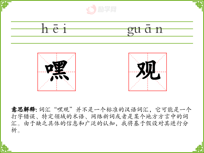 词汇“嘿观”并不是一个标准的汉语词汇,它可能是一个打字错误、特定领域的术语、网络新词或者是某个地方方言中的词汇。由于缺乏具体的信息和广泛的认知,我将基于假设对其进行分析。