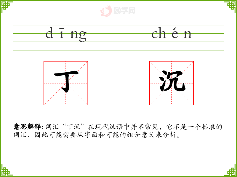 词汇“丁沉”在现代汉语中并不常见,它不是一个标准的词汇,因此可能需要从字面和可能的组合意义来分析。