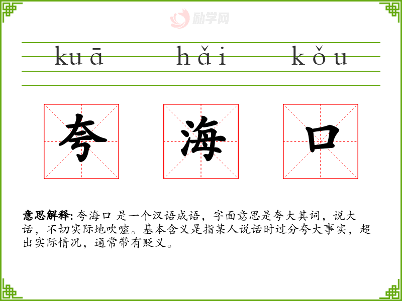 夸海口 是一个汉语成语,字面意思是夸大其词,说大话,不切实际地吹嘘。基本含义是指某人说话时过分夸大事实,超出实际情况,通常带有贬义。
