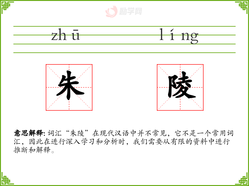 词汇“朱陵”在现代汉语中并不常见,它不是一个常用词汇,因此在进行深入学*和分析时,我们需要从有限的资料中进行推断和解释。