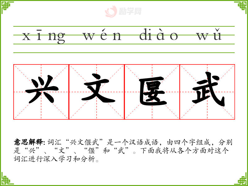 词汇“兴文偃武”是一个汉语成语,由四个字组成,分别是“兴”、“文”、“偃”和“武”。下面我将从各个方面对这个词汇进行深入学*和分析。