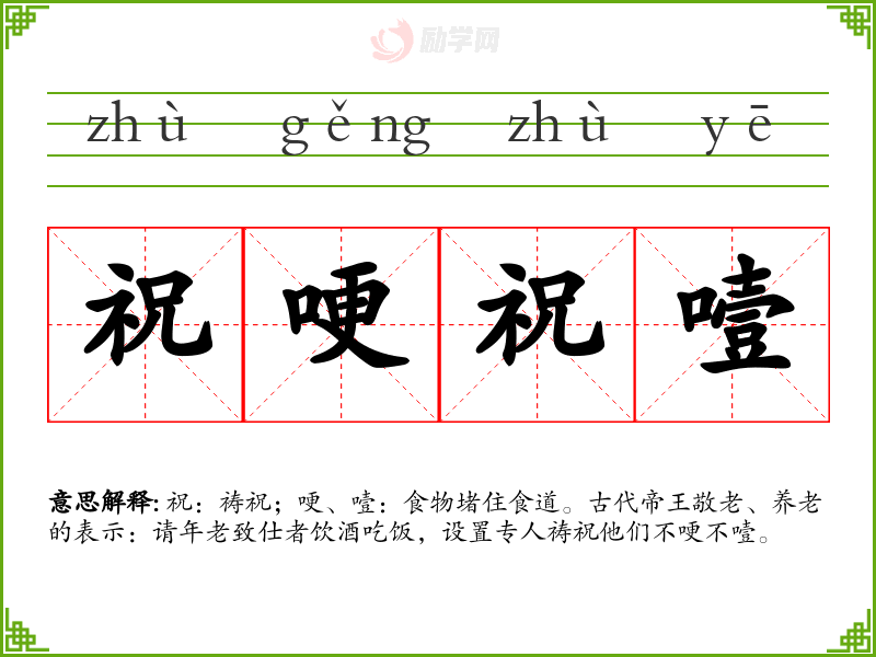 祝:祷祝;哽、噎:食物堵住食道。古代帝王敬老、养老的表示:请年老致仕者饮酒吃饭,设置专人祷祝他们不哽不噎。