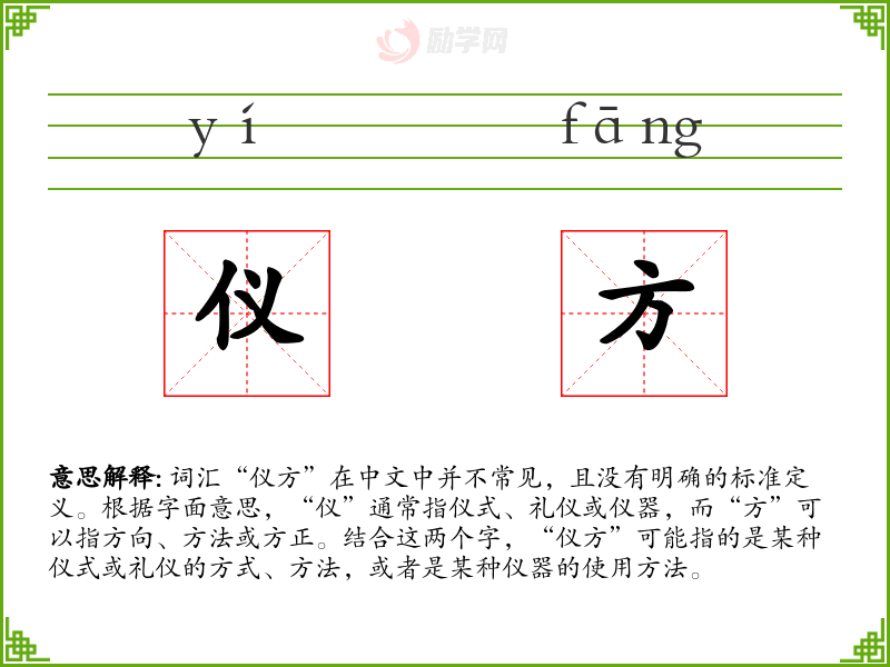 词汇“仪方”在中文中并不常见,且没有明确的标准定义。根据字面意思,“仪”通常指仪式、礼仪或仪器,而“方”可以指方向、方法或方正。结合这两个字,“仪方”可能指的是某种仪式或礼仪的方式、方法,或者是某种仪器的使用方法。