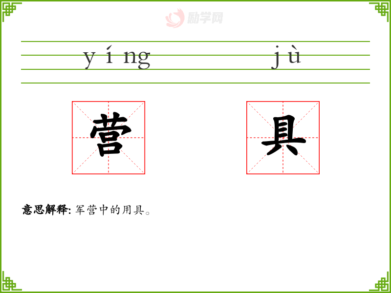 营具的意思是:军营中的用具。