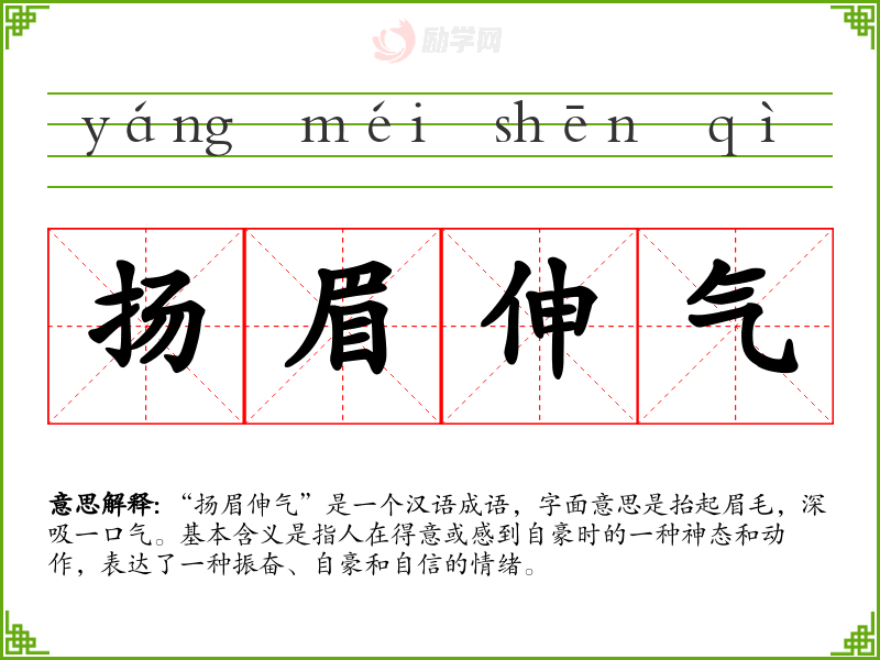 “扬眉伸气”是一个汉语成语,字面意思是抬起眉毛,深吸一口气。基本含义是指人在得意或感到自豪时的一种神态和动作,表达了一种振奋、自豪和自信的情绪。