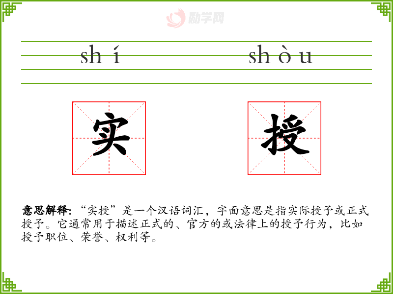 “实授”是一个汉语词汇,字面意思是指实际授予或正式授予。它通常用于描述正式的、官方的或法律上的授予行为,比如授予职位、荣誉、权利等。