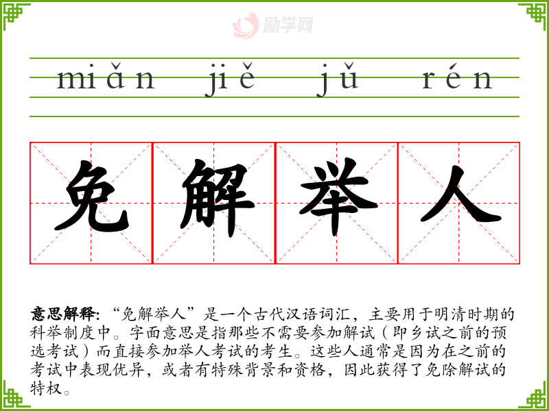 在现代生活中,这个词汇可能不太常用,但在学***历史或参与相关文化活动时,了解“免解举人”的概念可以帮助更深入地理解古代社会的运作和价值观。