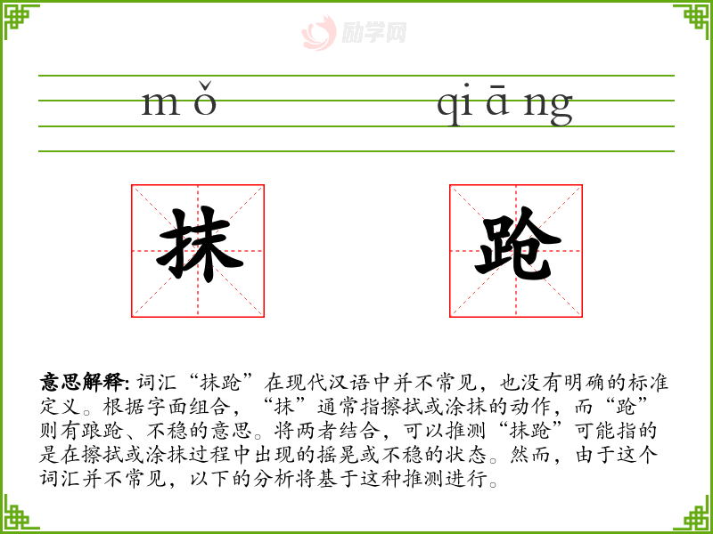“抹跄”作为一个不常见的词汇,其含义和用法相对有限。在语言学习和表达中,了解这样的词汇可以帮助丰富词汇量,但在实际使用中可能需要谨慎,以免造成理解上的困难。