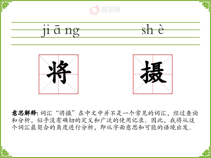词汇“将摄”在中文中并不是一个常见的词汇,经过查询和分析,似乎没有确切的定义和广泛的使用记录。因此,我将从这个词汇最契合的角度进行分析,即从字面意思和可能的语境出发。