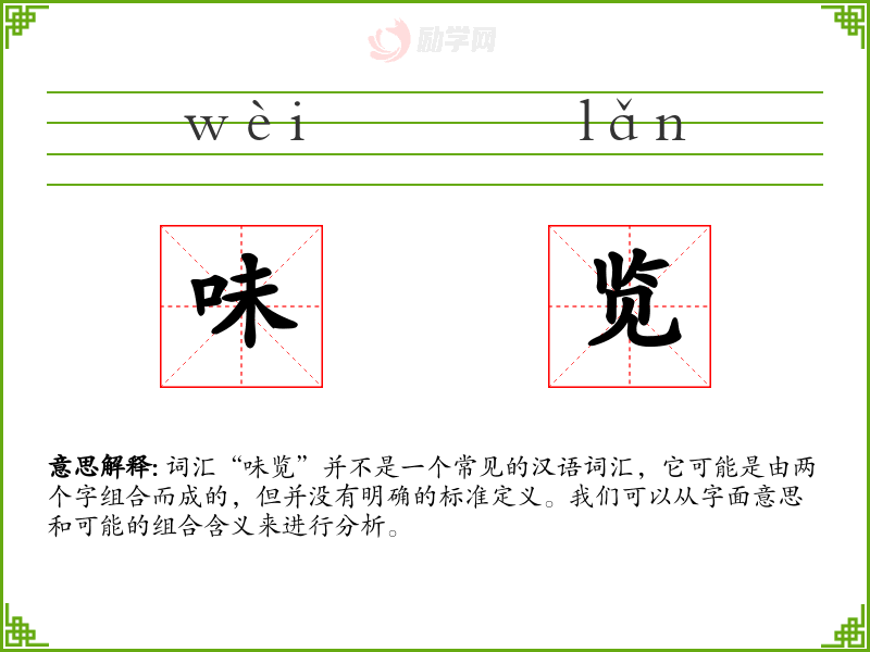 词汇“味览”并不是一个常见的汉语词汇,它可能是由两个字组合而成的,但并没有明确的标准定义。我们可以从字面意思和可能的组合含义来进行分析。