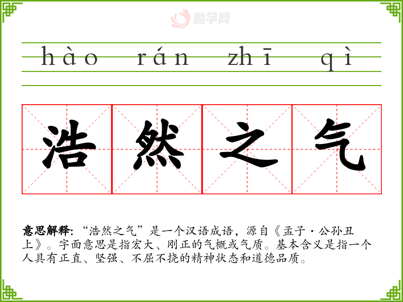 “浩然之气”是一个汉语成语,源自《孟子·公孙丑上》。字面意思是指宏大、刚正的气概或气质。基本含义是指一个人具有正直、坚强、不屈不挠的精神状态和道德品质。