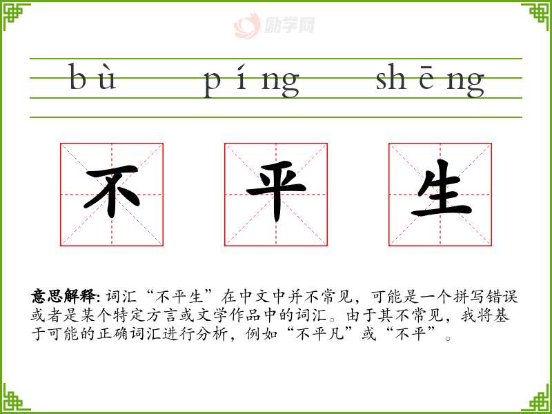 词汇“不平生”在中文中并不常见,可能是一个拼写错误或者是某个特定方言或文学作品中的词汇。由于其不常见,我将基于可能的正确词汇进行分析,例如“不平凡”或“不平”。